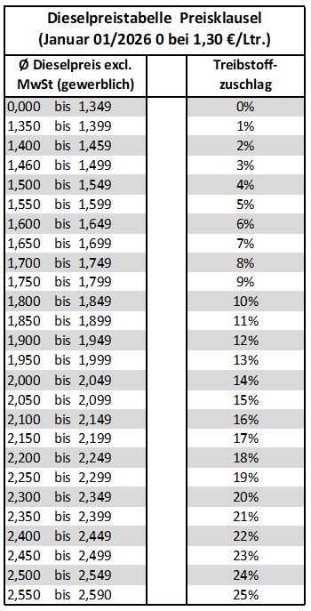 * Grundlage für die Ermittlung des Dieselpreiszuschlags ist der jeweils veröffentlichte durchschnittliche Dieselpreis (ohne MwSt.) gemäß der wöchentlichen Dieselpreisinformation des BGL e.V. für Deutschland.